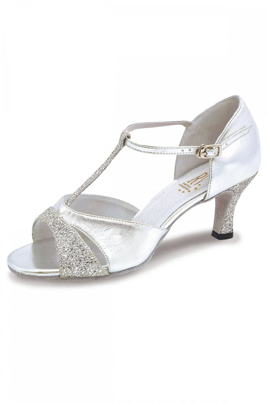 Lucina Ladies Ballroom Shoes with T-Bar straps, Coag/Brocade upper, 2.5" slim flared heel, quick fasten buckle, leather lining, and Super-flexi suede soles.