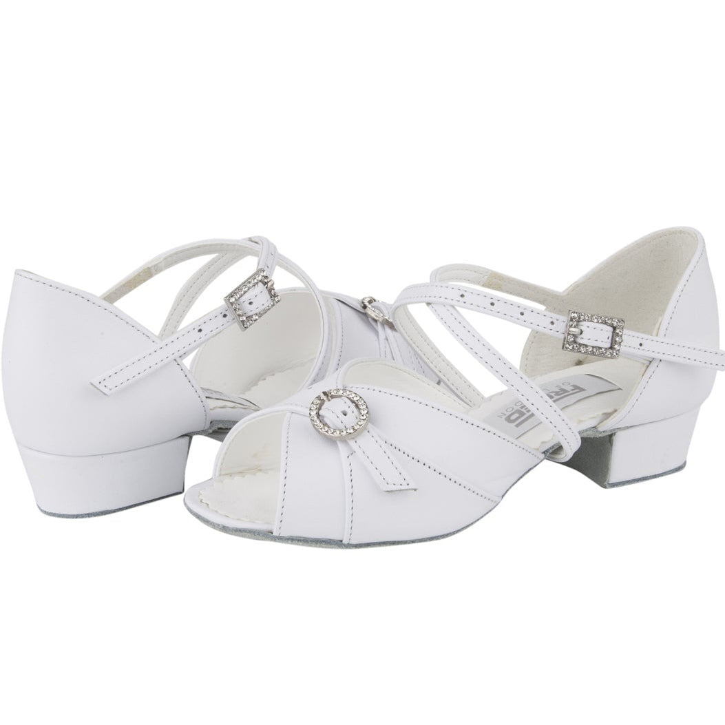 A leather open toe shoe with crossover straps, adjustable vamp and diamante buckles. 1” HEEL